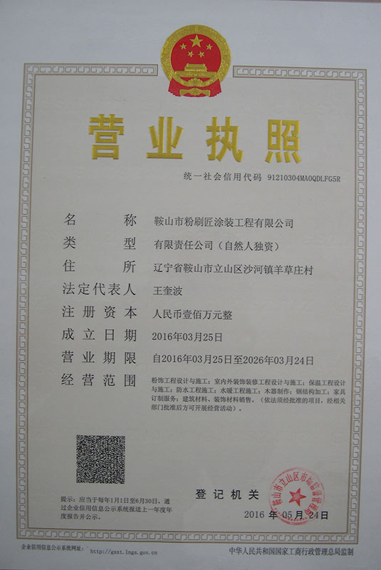 鞍山市粉刷匠涂装工程有限公司是一家集研发、生产、销售、施工为一体的综合性涂装企业,企业下设洪泽涂料厂、土建公司、结构公司、管道公司、装修公司及多家销售机构;公司生产设备先进,技术创新,产品稳定,自成立以来深受广大用户的好评;公司拥有经过培训的专业施工队伍,高空作业资质,齐全的现代化施工工具及作业设备的设计团队,丰富的施工经验,高水平有责任感的管理核心,能给您装点好的环境。